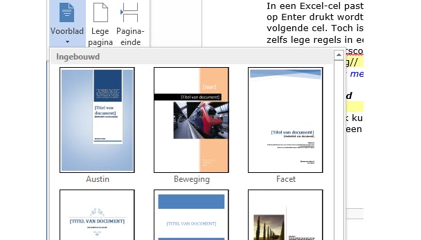 Een eerste indruk kun je maar één keer maken en dat geldt ook voor je documenten. Geef je documenten een voorblad dat er gewoon super-professioneel uitziet. Open het document waar je een voorblad aan wilt toevoegen. Klik op Invoegen / Pagina's / Voorblad. Zoek in de lijst met voorbeelden een mooi voorblad en klik erop. Tussen haken staan de gegevens die je nog moet toevoegen.