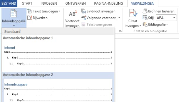 Klik op tabblad Verwijzingen / Inhoudsopgave en kies de lay-out van de inhoudsopgave die je mooi vindt. En even later staat helemaal automatisch de inhoudsopgave met kloppende paginanummers in het document.