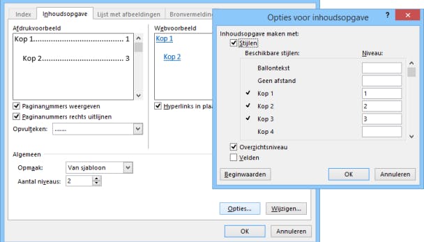 Klik op Opties en je komt in een lastig te begrijpen venster. Links staan de stijlen die in het document zitten en rechts van elke stijl een invoerveld. Dit laatste is het niveau. Wil je dat Kop1 inderdaad de belangrijkste in de inhoudsopgave is, dan moet daar een 1 staan. Wil je Kop2 helemaal niet in de inhoudsopgave zien, maak dan het veld Niveau achter Kop2 leeg. En wil je Kop3 als tweede belangrijkste element in de inhoudsopgave, geef die dan niveau 2. En om een stijl die standaard helemaal niet wordt meegenomen toch in de inhoudsopgave te krijgen, geef je die ook een niveau. Klik dan op OK.