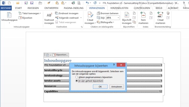 Nu je de opties van de inhoudsopgave hebt aangepast, moet je nog wel de inhoudsopgave zelf bijwerken. Word maakt dan opnieuw de inhoudsopgave volgens de nieuwe, aangepaste regels.