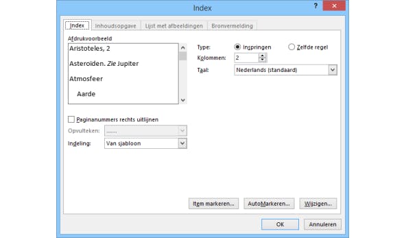 De woorden die je in het register wilt opnemen, kun je allemaal individueel markeren via tabblad Verwijzingen / Index / Item markeren. De opties in het scherm Indexvermelding markeren kun je meestal onveranderd laten. Ben je klaar met de markeringen, ga dan naar de laatste pagina van het document en kies tabblad Verwijzingen / Index / Index invoegen. Het vinkje Paginanummers rechts uitlijnen is evenals het aantal achter de optie Kolommen essentieel voor het uiterlijk van het register. Bevestig met OK om de index in te voegen.