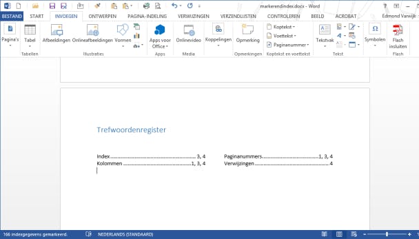 Sla het document op en sluit het. Ga nu naar het document waar je de index aan wilt toevoegen. Klik op tabblad Verwijzingen / Index invoegen / Automarkeren. Selecteer het document waarin je de items voor de index hebt genoteerd, het document met de toevoeging '-markeringen' in de naam. Nu worden alle woorden in het document die overeenkomen met het markeringen-document automatisch gemarkeerd voor opname in de index. Linksonder in de statusbalk van Word zie je het aantal markeringen vermeld staan. Kies nu en kies tabblad Verwijzingen / Index / Index invoegen.