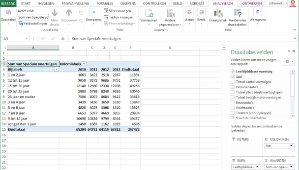 Bovendien kun je in de tabel zelf via de knoppen Kolomlabels en Rijlabels het totaal aantal velden in de tabel aanpassen. Bijvoorbeeld alleen gegevens over 2010 en 2011 zien en niet ook over 2009 en 2008. Het is allemaal mogelijk en wordt razendsnel geanalyseerd.