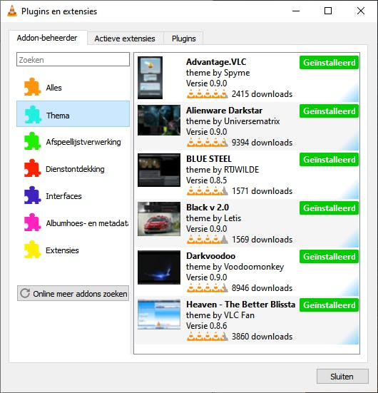 Wil je VLC alleen een nieuw uiterlijk geven, selecteer dan de rubriek Thema. Mocht je de naam van een plug-in kennen, dan kun je er via het zoekvak ook direct naar zoeken.