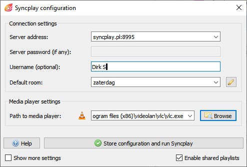 Nadat je Syncplay hebt geïnstalleerd, open je het configuratievenster van deze app. In het bovenste vakje selecteer je in het keuzemenu een van de actieve gratis Syncplay-servers. Geef eventueel een gebruikersnaam op als je straks niet als ‘anonymous’ benoemd wilt worden. Bij Default room moet je een naam verzinnen voor de kamer waar je de video wilt delen. In het vak Path to media player maakt Syncplay de verbinding met VLC. Standaard vult deze tool zelf de locatie in: C:\Program Files (x86)\videolan\vlc\vlc. Staat de mediaspeler op een andere locatie, dan moet je de knop Browse gebruiken. Daarna klik je op de knop Store configuration and run Syncplay. De andere deelnemers moeten uiteraard dezelfde server en de juiste kamer selecteren.