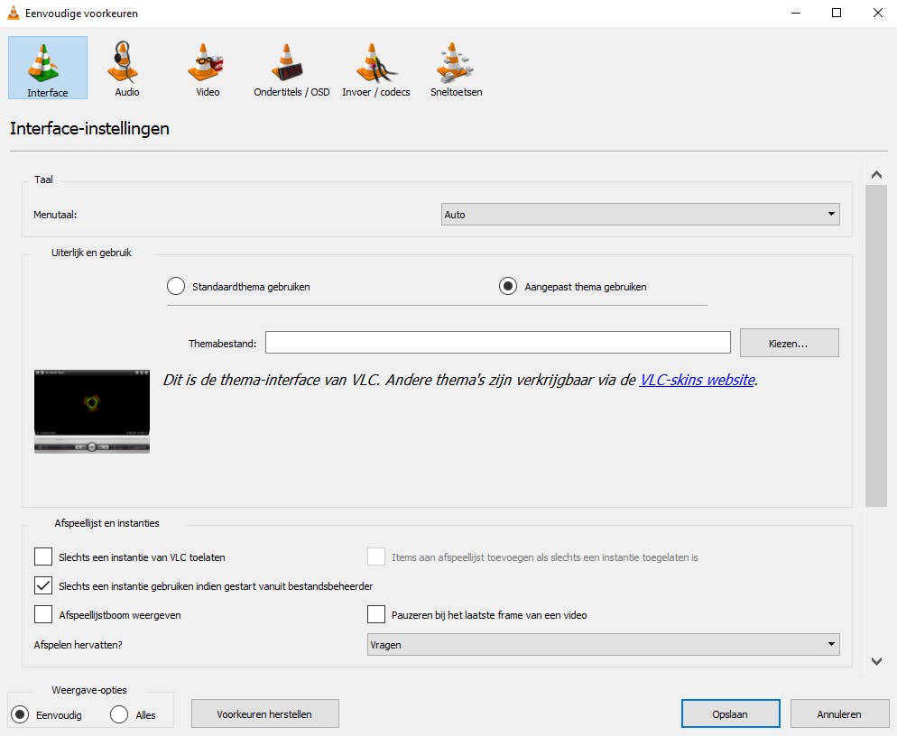Sommige skins zijn speciaal ontworpen om VLC slechts minimale schermruimte in te laten nemen. Iets wat vooral handig is als je VLC als audiospeler wilt gebruiken. Het nadeel van deze minispeler is dat de uitgebreide menu’s verstopt zitten. Om zo’n thema bijvoorbeeld ongedaan te maken, moet je de rechtermuisknop gebruiken, waarna je via het menu Interface terug kunt naar de Instellingen om zo het standaardthema weer in te stellen. Vergeet ook niet op de Bewaar-knop te klikken en VLC opnieuw op te starten, anders wijzigt het thema niet.