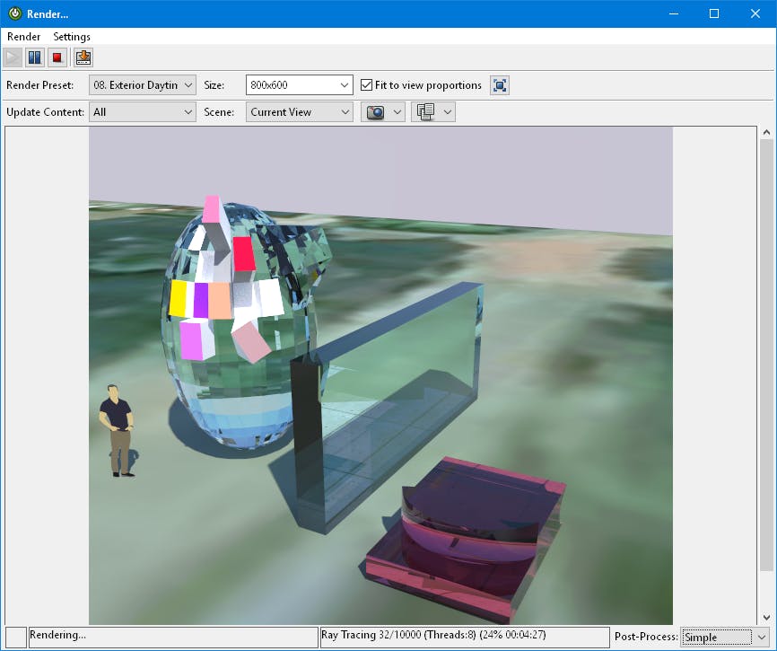 Daarbij kun je kiezen uit een aantal ‘quick and dirty’ methodes (nog altijd fraaier dan wat SketchUp zelf biedt) tot zeer hoogwaardig doorgerekende afbeeldingen waar zelfs een vlotte pc flink op moet rekenen. Ook kun je op die definitieve afbeelding nog allerlei post-processing loslaten zoals het toevoegen van lichtgloed.