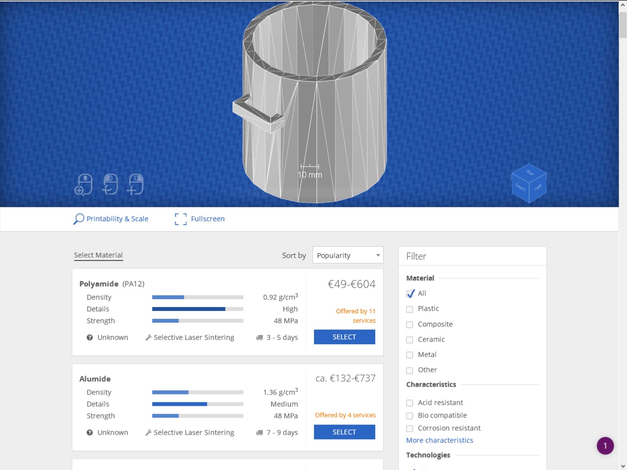 Zoals je ziet liegen de prijzen er niet om. Printprijzen zijn opgebouwd uit proceskosten en materiaalkosten en met name op die laatste valt veel te besparen door goed op te letten of een model hol of massief is en – indien hol – hoe dik de wanden zijn. In hoeverre je hiermee kunt spelen hangt uiteraard van het gebruiksdoel van een model af. De site waarschuwt in elk geval als wanden te dun zijn en modellen daardoor breekbaar.