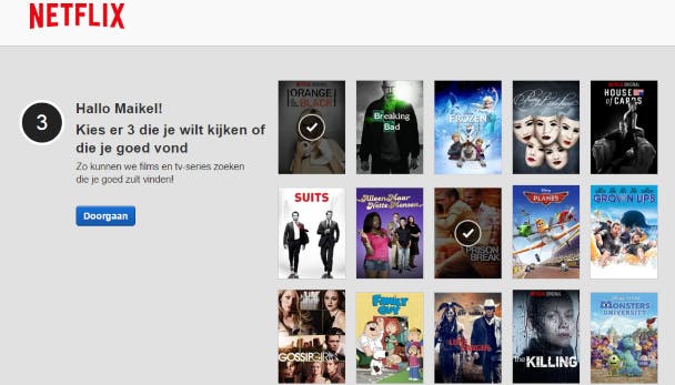 Nadat je voor de eerste keer bent ingelogd, wil Netflix graag weten op welke apparaten je de streamingdienst nog wilt gaan gebruiken. Naast je pc, kun je ook films streamen naar een tablet, smartphone en televisie. We leggen verderop in dit artikel uit hoe je hiervoor een smart-tv gebruikt. Maak een keuze en klik op Doorgaan. Geef in de volgende stap aan welke gezinsleden Netflix nog meer gaan gebruiken. Iedereen krijgt daarmee zijn of haar eigen profiel. Deze functie is de moeite waard, want Netflix doet persoonlijke aanbevelingen op het gebied van films en series. Klik door naar de volgende stap. De videodienst wil graag weten welke films je leuk vindt. Op basis van je filmsmaak krijg je later diverse suggesties voorgeschoteld. Zodra je klikt op Doorgaan kom je op je persoonlijke Netflix-pagina terecht.