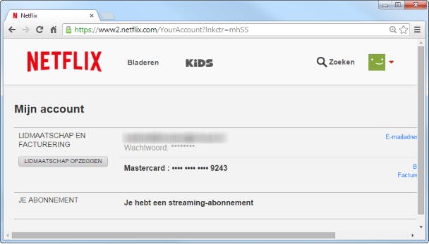 Heb je na de gratis proefmaand geen zin om voor een Netflix-account te betalen? Zeg dan tijdig je abonnement op, want anders brengt de videodienst alsnog kosten in rekening. Ga naar www.netflix.com en klik rechtsboven op Aanmelden. Je typt je e-mailadres en wachtwoord, waarna je klikt op Aanmelden. Binnen je persoonlijke Netflix-omgeving klik je rechtsboven op je profielnaam. Ga vervolgens naar Mijn account. Onder LIDMAATSCHAP EN FACTURERING klik je daarna op LIDMAATSCHAP OPZEGGEN. Bevestig ten slotte met Opzegging voltooien. Je ontvangt ter bevestiging een e-mail.