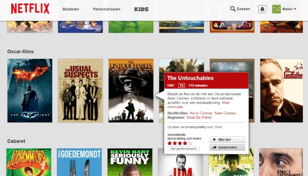 Wanneer je de gebruikersomgeving van Netflix opent, beland je in een overzicht met allerlei afbeeldingen van mooie films en series. Scrol naar beneden om te zien welke titels Netflix voor jou geselecteerd heeft. Verder sorteert de videodienst het aanbod op genre, bijvoorbeeld Actie, Nederlandse films, Documentaires, Drama en Cabaret. Weet je al welke titel je wilt bekijken? Klik dan rechtsboven op Zoeken en voer de naam in van de film of een acteur. Zodra je met de muis op een afbeelding van een film of serie gaat staan, verschijnt er een korte beschrijving. Klik erop om direct de weergave op je computer te starten. Via de tekstballon rechtsonder wijzig je zo nodig het audiospoor en de ondertiteling. Gebruik verder het pictogram met het vierkant om het beeld op volledig scherm weer te geven.