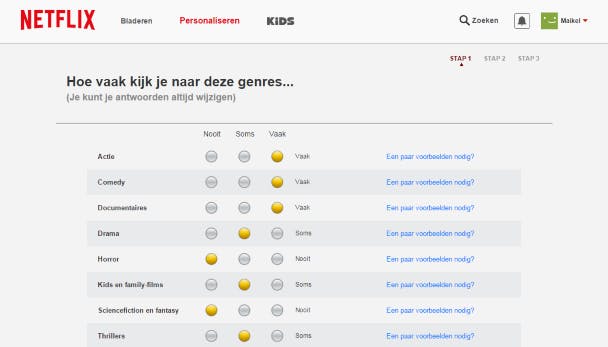 De catalogus van Netflix kun je personaliseren. De videodienst laat dan in eerste instantie vooral titels zien die passen bij je filmsmaak. Klik bovenaan op Personaliseren en dan op Laten we beginnen. Geef aan hoe vaak je naar de voorgestelde genres kijkt. Je hebt hierbij keuze tussen Nooit, Soms en Vaak. Maak een keuze en klik op Doorgaan. Netflix laat nu een aantal titels zien. De bedoeling is dat je een beoordeling toekent aan films die je al hebt gezien. Geef op een schaal van één tot en met vijf sterren je oordeel. Kies onder aan de pagina voor Doorgaan. In de volgende stap komt de videodienst met nog meer titels op de proppen die je kunt beoordelen. Via Doorgaan stelt Netflix een overzicht samen van je persoonlijke voorkeuren.