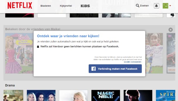 Je kunt je Netflix-account eventueel koppelen aan Facebook. Op die manier zie je welke films en series vrienden onlangs hebben gekeken. Daarnaast kunnen vrienden zien welke titels je zelf hebt gezien. Overigens publiceert Netflix namens jou geen statusberichten op Facebook. Scrol in de catalogus een stukje omlaag en kies ergens halverwege voor Verbinding maken met Facebook. Nadat je de juiste inloggegevens hebt ingevuld, bevestig je met Aanmelden. Netflix wil toegang tot je openbare profiel, vriendenlijst en vind-ik-leuks. Via OK geef je hiervoor toestemming. Merk op dat aan de catalogus het onderdeel Favorieten van vrienden is toegevoegd.