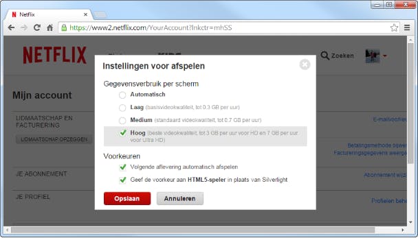 Netflix kiest automatisch een beeldresolutie die past bij de snelheid van je internetverbinding. Wil je zeker weten dat je films en series altijd in de beste kwaliteit bekijkt? Klik dan rechtsboven op je profielnaam en ga naar Mijn account. Kies daarna voor Instellingen voor afspelen. Bij het onderdeel Gegevensverbruik per scherm heb je keuze tussen Laag, Medium en Hoog. Wanneer je zeker weet dat je internetverbinding snel genoeg is om HD-beelden te verwerken, selecteer je de optie Hoog. Bewaar tot slot deze wijziging via Opslaan.