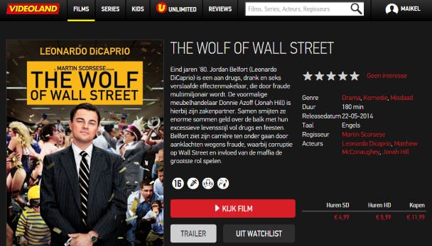 Nadat je een account hebt aangemaakt, kun je bij Videoland eenvoudig films huren. De gebruikersomgeving is min of meer vergelijkbaar met die van Netflix. Ook deze videodienst presenteert het aanbod aan de hand van afbeeldingen. De catalogus rangschik je desgewenst op genre, kijkwijzer en taal. Klik linksboven op FILMS. Via FILTERS / GENRE kun je bijvoorbeeld een overzicht van actiefilms of documentaires weergeven. Klik op een filmafbeelding om meer details weer te geven. Je kunt dan een samenvatting lezen, zien uit welke filmsterren de cast bestaat en wat de kosten zijn om de film te huren. Wanneer je de beste beeldkwaliteit wenst, huur je altijd de HD-versie. Bij recente titels betaal je hiervoor eenmalig 5,99 euro, waarna je twee dagen de tijd hebt om de films te bekijken. Kies voor KIJK FILM en betaal het gevraagde bedrag via iDEAL of creditcard. Na de betaling kun je direct beginnen met kijken. Wil je de film echter niet direct kijken, dan kun je de titel toevoegen aan je favorietenlijst. Klik in dat geval op +WATCHLIST.