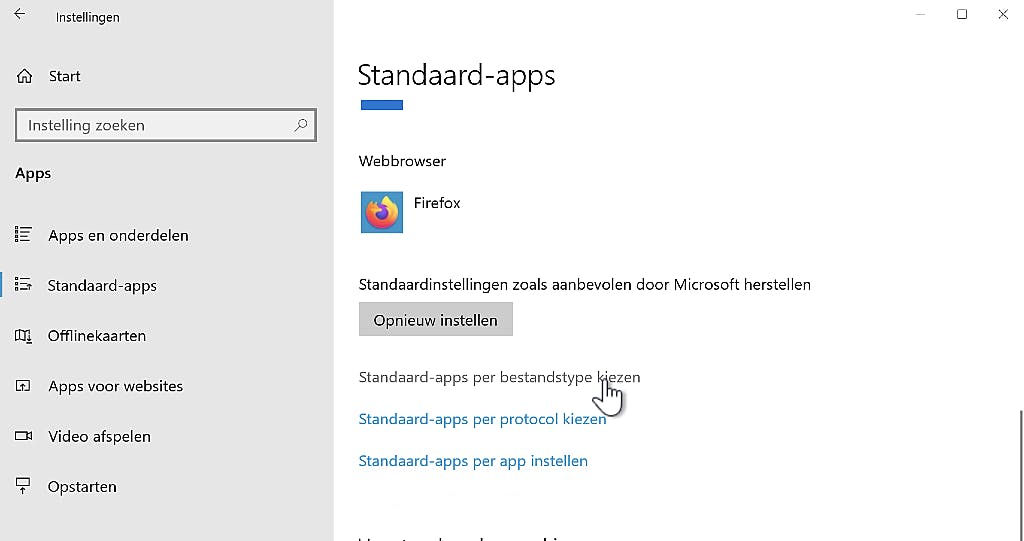 De nieuwe Edge circuleert feitelijk al sinds vorig jaar zomer, maar in april dit jaar is de oude versie middels een update-ronde definitief voor iedereen vervangen door de nieuwe. Mocht dat bij jou om een of andere reden nog altijd niet gebeurd zijn, dan kun je de Chrome-gebaseerde Edge ook handmatig downloaden en installeren vanaf deze pagina. Is de browser eenmaal geïnstalleerd, dan is de kans groot dat deze (weer) als standaard viewer is ingesteld voor allerlei bestandsformaten, waaronder PDF. Wil je liever gewoon je oude vertrouwde PDF-viewer en (of) editor gebruiken, dan is het zaak om dat snel te herstellen. Klik daarvoor in het menu Start op Instellingen. In het geopende venster klik je op Apps en dan Standaard Apps in de kolom links. Klik dan – rechts – op Standaard-apps per bestandstype.