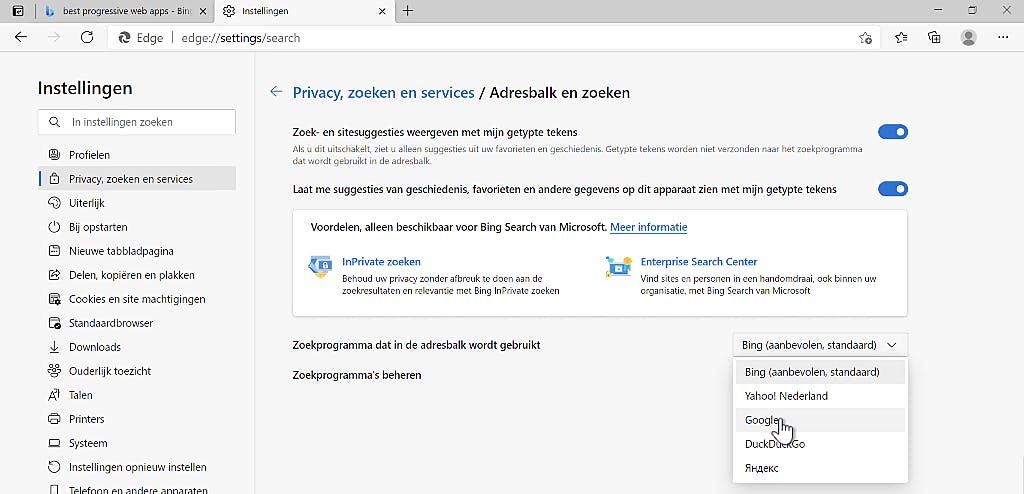 Edge gebruikt van oudsher het huiseigen Bing als standaard zoekmachine. Wil je liever het vertrouwde Google daarvoor gebruiken, dan klik je in het hoofdvenster van Edge op … helemaal rechtsboven in beeld. Klik in het geopende contextmenu op Instellingen. Klik in de kolom links op Privacy, zoeken en services. Scroll in het paneel rechts helemaal naar beneden en klik op Adresbalk en zoeken. Kies achter Zoekprogramma dat in de adresbalk wordt gebruikt voor Google. Of als je heel privacy-bewust bent (maar dan is ’t de vraag of het slim is om Edge te gebruiken…) voor DuckDuckGo. En doorloop – nu je dan toch in het Instellingenvenster bent aanbeland – gelijk even de diverse categorieën en pas dingen eventueel naar smaak en wens aan. Besteed daarbij wat extra aandacht aan privacy-instellingen.