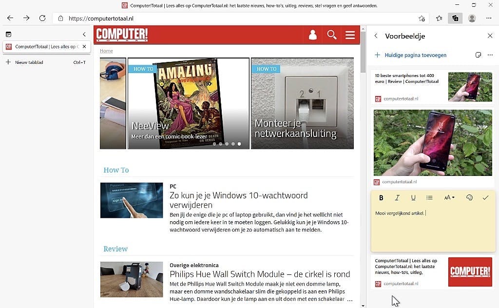 Ben je bezig met een werkstuk, rapport of scriptie dan is verzamelen van informatie een van de meest voorkomende klussen. Naast de noeste type-arbeid vanzelfsprekend. Met het eerste kan Edge je alvast een eind op weg helpen. Klik op de knop Collecties rechtsboven in de knoppenbalk (het exemplaar met de + er in). Je kunt nu vanuit een geopende webpagina in het paneel links onderdelen als afbeeldingen, links en meer slepen naar het paneel rechts. Zo’n collectie kun je een naam geven door simpelweg op de standaardnaam bovenaan het paneel rechts te klikken en iets van je gading in te voeren. Verder zijn opmerkingen in te voegen en onderdelen naar andere programma’s te verzenden via de knop … Je kunt meerdere collecties elk voorzien van hun eigen naam samenstellen. Klik daarvoor op < voor de collectienaam en dan op Nieuwe collectie starten. Zo kun je per onderwerp een verzameling interessante zaken verzamelen. Eigenlijk een soort van favorieten op steroïden zeg maar, en in de verte vergelijkbaar met OneNote, maar dan nu als onderdeel van je browser.