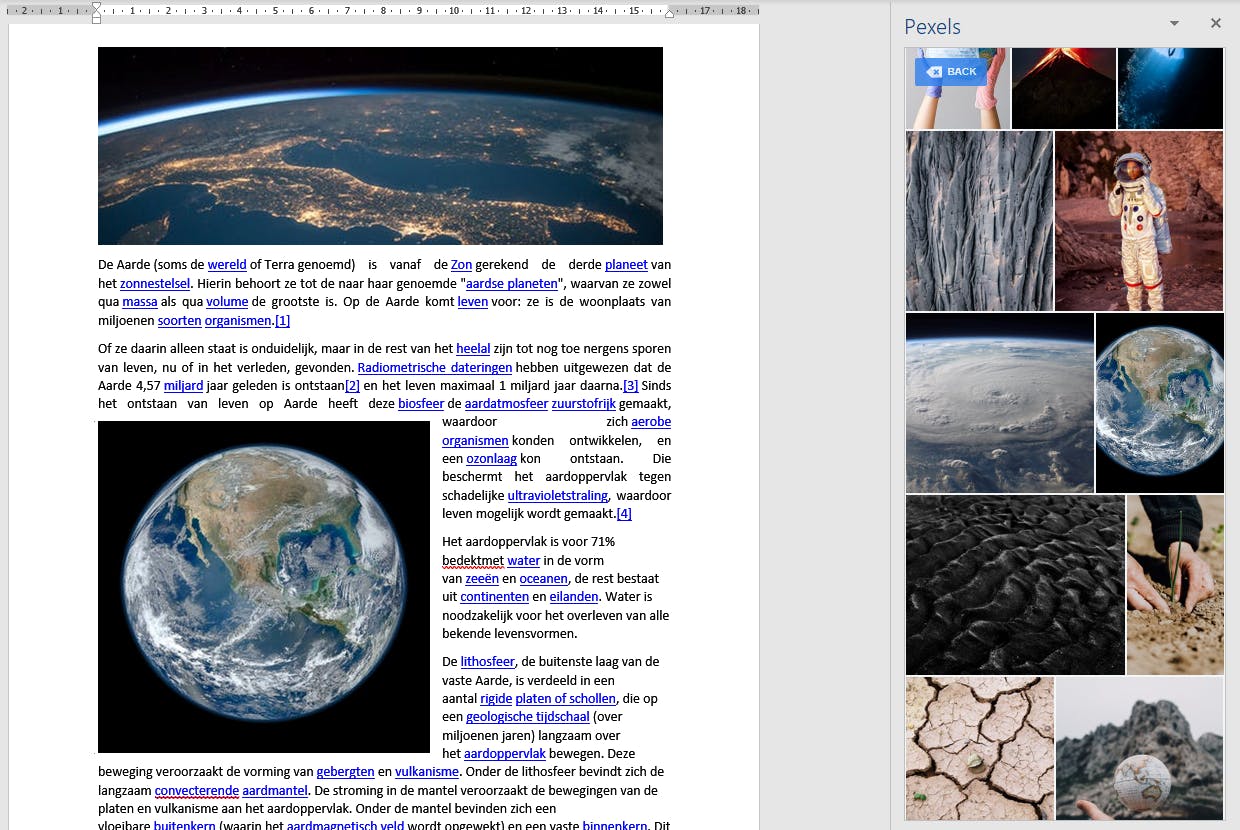 Om een project van goede foto’s te voorzien, moet je uiteraard rekening houden met auteursrechten, tenzij je de plug-in Pexels gebruikt. Dit is een bron waar fotografen hun werk vrij ter beschikking stellen. Alle foto’s mag je gratis gebruiken en het is zelfs niet nodig om de fotograaf te vermelden. En niets belet je om de foto’s te bewerken. In het tabblad Invoegen van Word verschijnt na installatie de knop Open Pexels, en in de zijbalk zoek je op onderwerp en kleur.