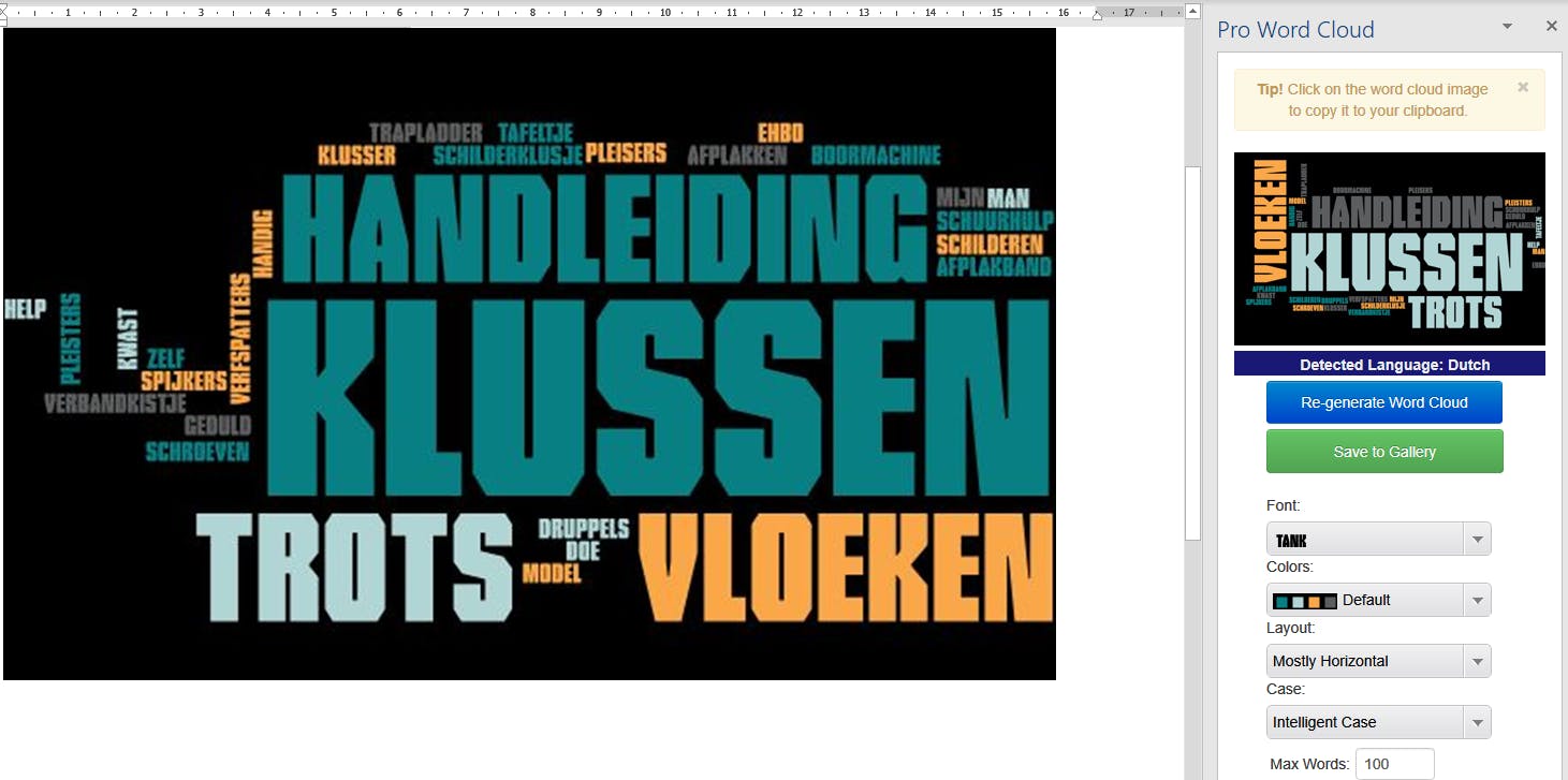 Je hoeft geen online generator te zoeken om een woordenwolk samen te stellen. Activeer Pro Word Cloud en typ of plak de woordenlijst in het Word-document. Met deze plug-in geef je aan hoe breed en hoog de wolk moet worden, je selecteert een lettertype en een kleurenschema. De woorden die vaker voorkomen, zijn groter dan termen die slechts één of twee keer in de lijst staan. Daarbij geef je aan of je de woorden meestal horizontaal, verticaal of kriskras door elkaar wilt zien. Wanneer je op de miniatuurwolk klikt, wordt die gekopieerd zodat je die kunt plakken in een ander document.