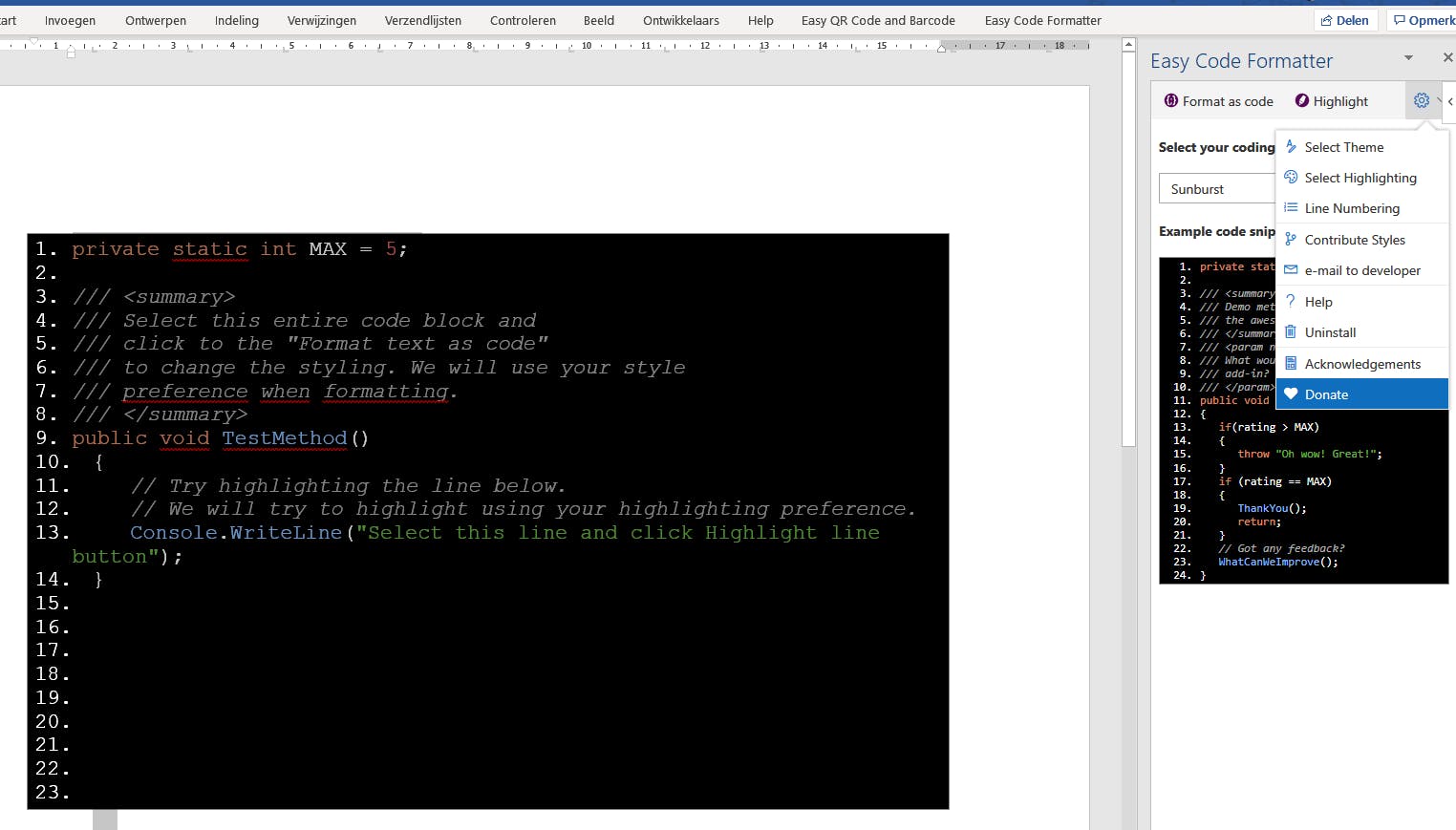 Om code op te maken, hoef je slechts de tekst te selecteren en open je Easy Code Formatter dat als tabblad in het lint is gekomen. Daar kun je de knop Format text as code gebruiken en de knop Highlight selected line om bepaalde lijnen te markeren. Via de knop Code formatter settings open je de rechterbalk en kun je verschillende codeerthema’s uitproberen. Hier kun je ook de optie lijnnummering activeren, wat natuurlijk veel makkelijker werkt.