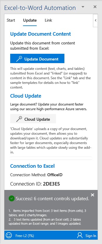 De invoegtoepassing Excel-to-Word Document Automation is een mondvol voor de invoegtoepassing die de brug legt tussen de twee Office-applicaties. Je installeert het zowel in Word als in Excel, want het is de bedoeling dat je Excel en Word-documenten met elkaar verbindt. Op die manier kun je de gekoppelde gegevens updaten en uitwisselen zonder dat je ze handmatig hoeft te kopiëren. Met de add-in kun je zowel tekst, lijsten, tabellen, afbeeldingen als grafieken koppelen. De basis-versie is gratis en daarmee mag je de eerste maand vijftig basisdocumenten verwerken, daarna is het gebruik beperkt tot tien bestanden per maand.