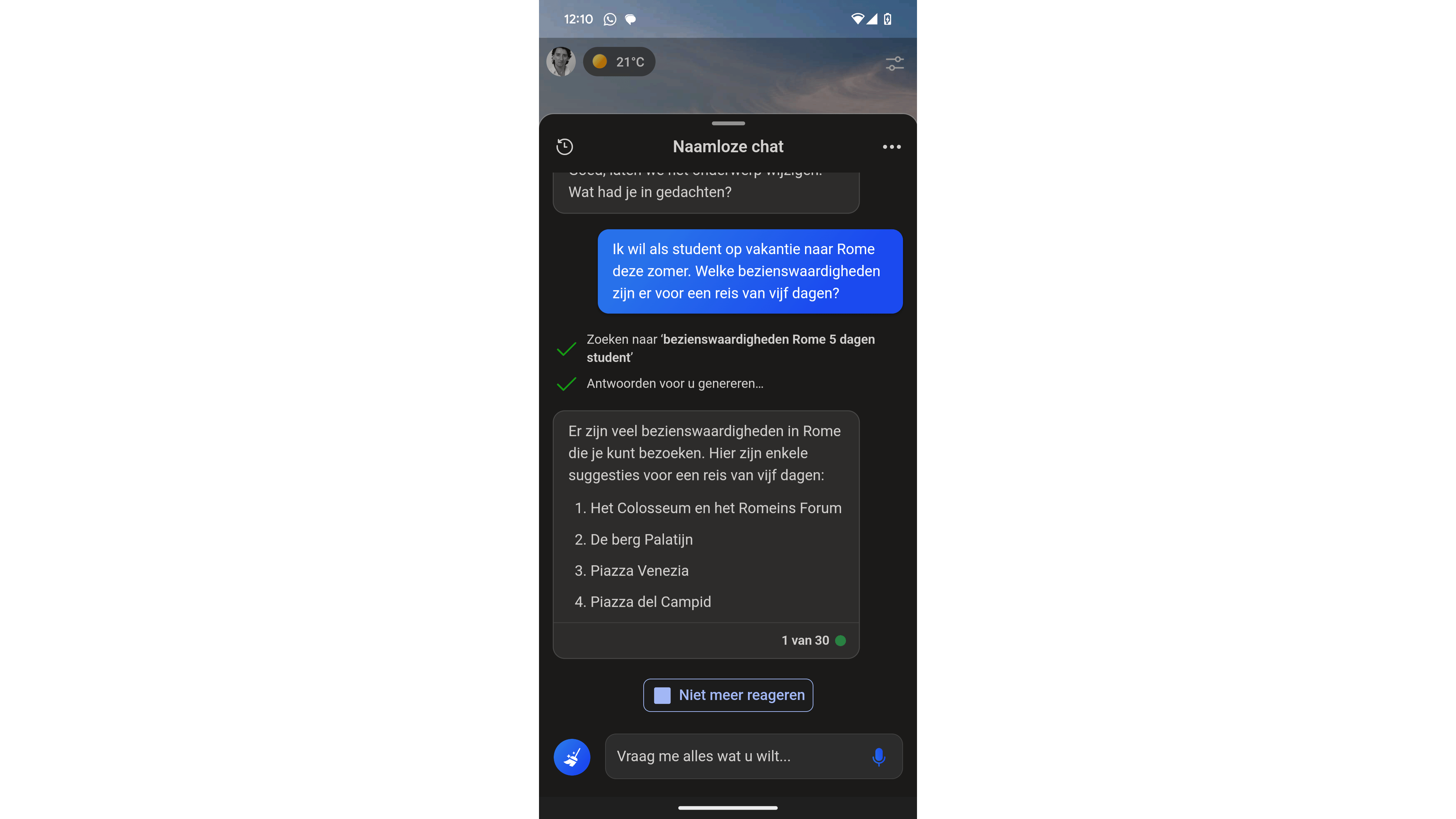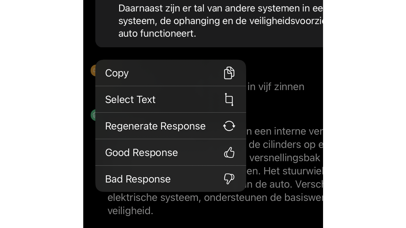 Net als in het echte leven hoeft een antwoord niet meteen bruikbaar te zijn. Is dat het geval, dan kun je om een nieuw antwoord vragen: zodra het antwoord in de conversatie verschijnt, tik je hierop en druk je je vinger er heel even op. Kies in het menu dat nu verschijnt voor Regenerate Response en het antwoord wordt opnieuw geformuleerd.