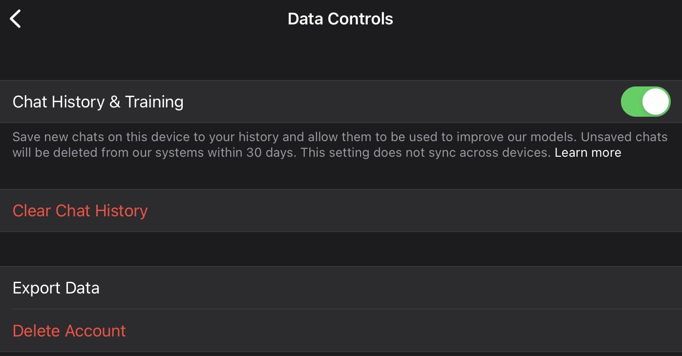 Nieuwe chatgesprekken worden standaard op je telefoon of tablet opgeslagen in de sectie met chatgeschiedenis. Deze conversaties kunnen dan ook worden gebruikt om het taalmodel van ChatGPT te verbeteren. Heb je dat liever niet, dan schakel je de functie uit. Kies in het instellingenvenster voor Data Controls. Zet de schuif op Uit bij Chat History & Training. Wil je de eerdere geschiedenis volledig verwijderen, dan tik je op Clear Chat History.