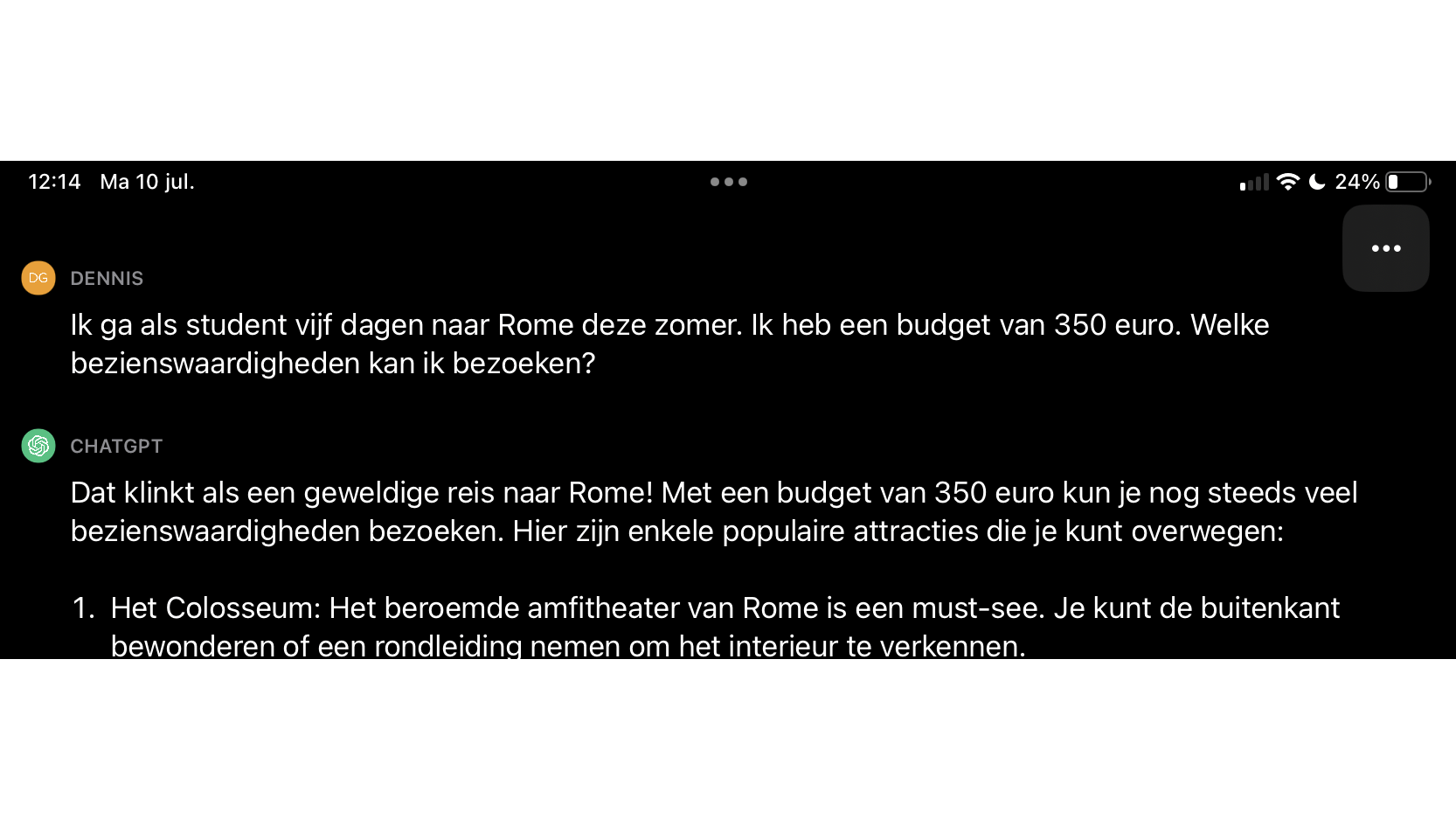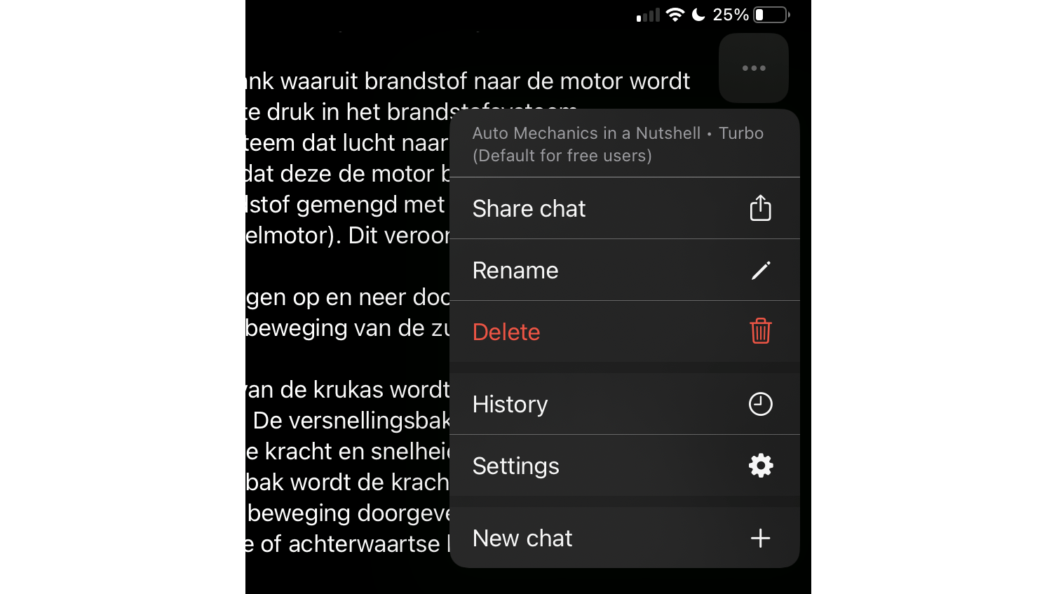 Het gaat hierbij om een momentopname. Ga je na het delen van de chat verder met je gesprek, dan is de rest van deze conversatie niet zichtbaar via de eerder gedeelde link. Voor een bijgewerkt gesprek, maak je een nieuwe link aan. Om met een schone lei te beginnen en een nieuwe conversatie te starten, tik je op de knop met de drie puntjes (…) en kies je New chat.