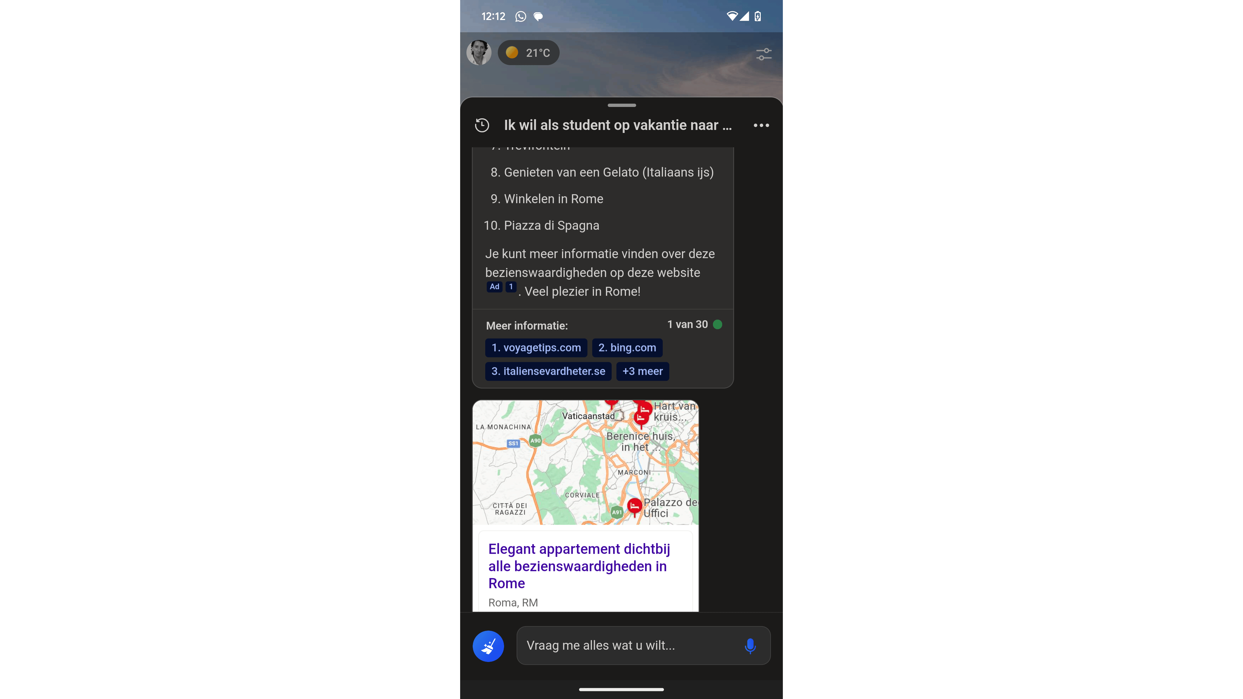 De app heeft een eenvoudige opbouw. In het grote vlak bovenin wordt de conversatie getoond. Onderin vind je een balk waarin je vragen, instructies en andere regels plaatst. Typ een bericht en tik op de knop ernaast om de vraag te stellen. In plaats hiervan kun je de invoer ook met je stem regelen: tik op de knop met de microfoon en spreek het bericht in.