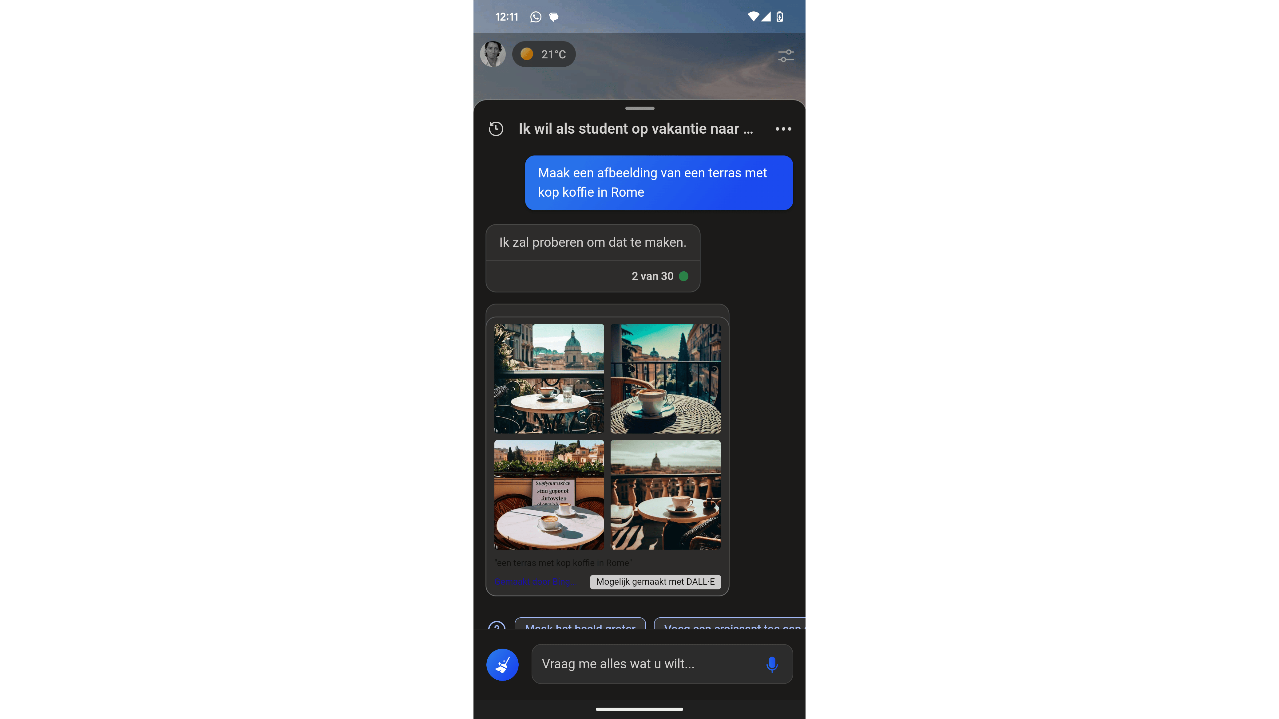 In het invoervak geef je een duidelijke beschrijving van de gewenste afbeelding, bijvoorbeeld ‘Maak een afbeelding van een chauffeur die in een gele vrachtwagen rijdt’. Je kunt het gesprek hierna voortzetten en de afbeelding verbeteren, bijvoorbeeld door elementen toe te voegen (zoals ‘Geef de lucht een aantal wolken’) of te veranderen (‘Verander de kleur van de vrachtwagen naar blauw’).
