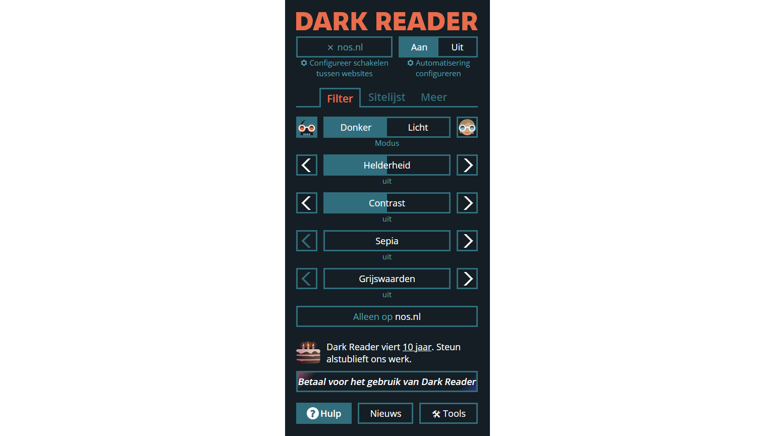 Eenmaal geïnstalleerd kun je met de extensie nagenoeg elke website in een donkere modus schakelen. Het gaat hier om een opensource-project, waaraan door een grote groep enthousiaste programmeurs al tien jaar wordt gesleuteld. Klik op het pictogram van Dark Reader om de instellingen te openen. Uiterst bovenin vind je de schakelaar om de donkere modus te activeren, maar de instellingen eronder zijn minstens even interessant.