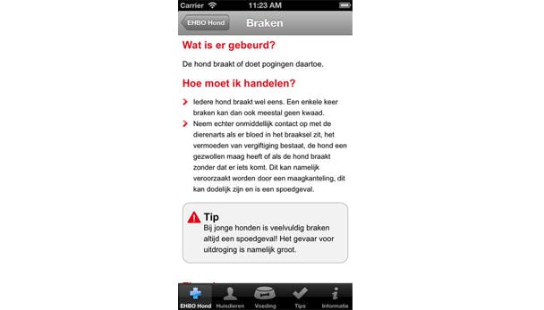 Net als bij jezelf, kan het ook weleens gebeuren dat jouw hond of kat verwondingen oploopt of zich even niet helemaal goed voelt. In die gevallen kan het de vraag zijn of je een dierenart moet raadplegen of dat de klachten vanzelf weer over gaan. Met EHBO voor Kat en Hond wordt het nu eenvoudiger om in te spelen op de gezondheid van jouw hond of kat. In de app vind je heldere uitleg en duidelijke tips over de meest uiteenlopende klachten. Daarnaast biedt de app je informatie over voeding en een handig logboek waarin je informatie over jouw honden en katten kan opslaan.