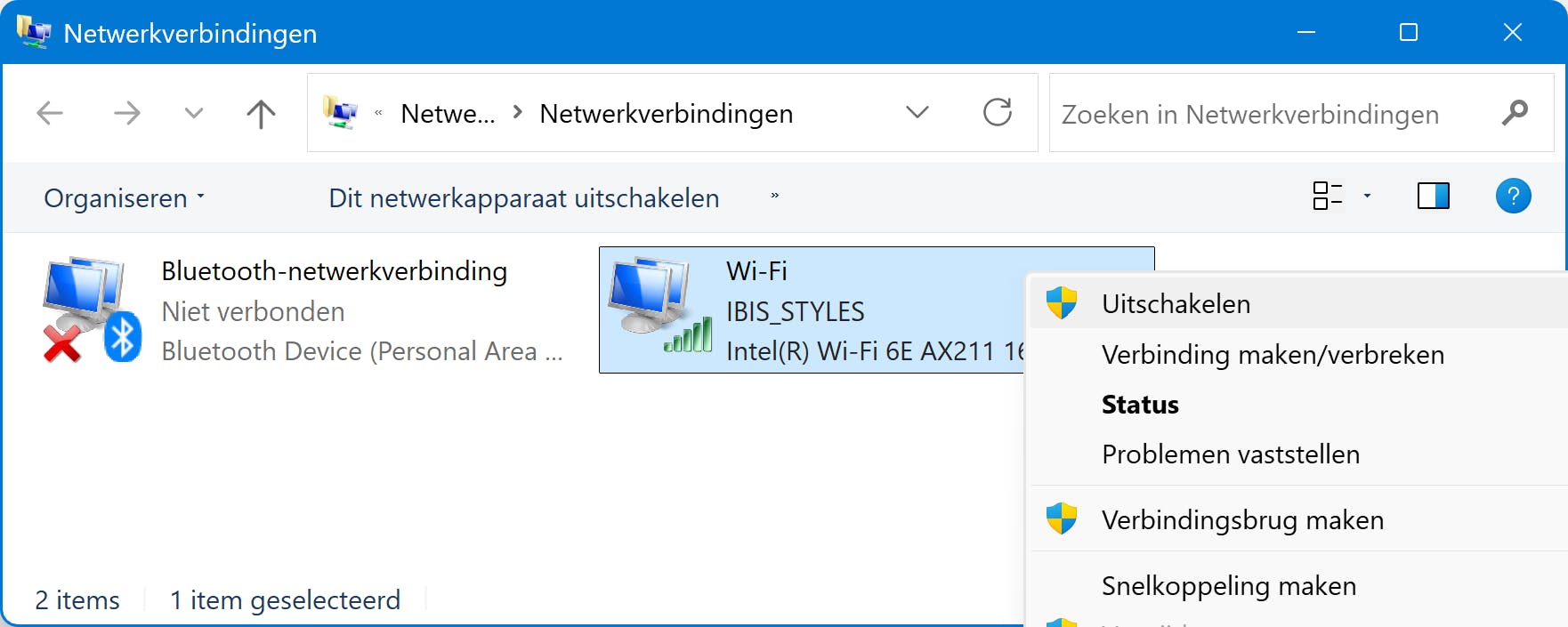 Je kent het ongetwijfeld: bij problemen even snel de netwerkverbinding willen herstellen door deze in en uit te schakelen. In Windows 11 is dat aardig weggestopt en al helemaal voor bekabelde verbindingen. Gelukkig is het klassieke Configuratiescherm-onderdeel nog beschikbaar. Open het Startmenu en typ ncpa.cpl. Het venster netwerkverbindingen verschijnt: alle draadloze én bekabelde verbindingen overzichtelijk in beeld, zonder opsmuk. Klik erop met rechts voor snelle acties, zoals Uitschakelen of Eigenschappen.