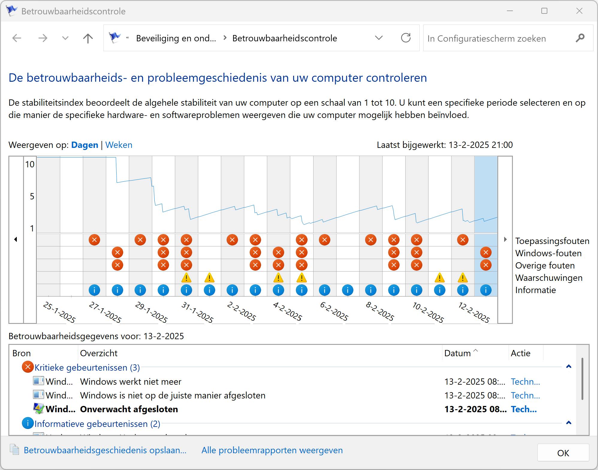 Windows houdt bij hoe het is gesteld met de prestaties van de machine. Heeft de computer een vastloper of gebeurt er iets onverwachts, dan wordt dit bijgehouden. De betrouwbaarheidscontrole geeft je een goed beeld van wat er mogelijk misgaat. Open het Startmenu en typ Betrouwbaarheid. Kies Betrouwbaarheidsgeschiedenis weergeven. In een tijdlijn lees je hoe de machine zich in de afgelopen tijd heeft ontwikkeld. Er wordt onderscheid gemaakt tussen verschillende incidenten, zoals kritieke gebeurtenissen, waarschuwingen en informatieve meldingen. Klik op een datum om te zien wat er op die dag aan de hand is. Dubbelklik op een onderdeel om de details te bekijken.