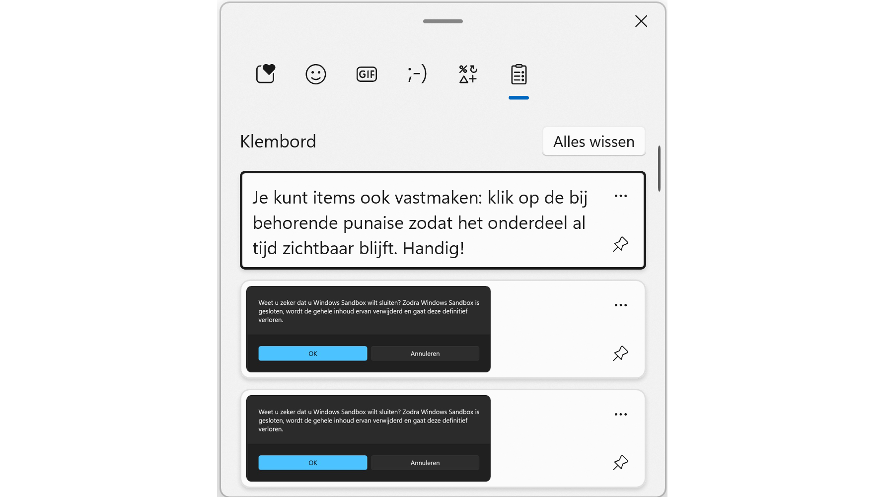 Op een gemiddelde dag kopieer en plak je aardig wat items. Heb je een item nodig dat je eerder hebt gekopieerd? Maak dan gebruik van de klembordgeschiedenis. Druk op Windows-toets+V en zie daar: een compact venster met een overzicht van eerder gekopieerde items. Klik op het item dat je nodig hebt om het weer te plakken. Of klik op de drie puntjes om het item uit de lijst te verwijderen (als je het toch niet meer nodig hebt). Je kunt items ook vastmaken: klik op de bijbehorende punaise zodat het onderdeel altijd zichtbaar blijft. Handig!