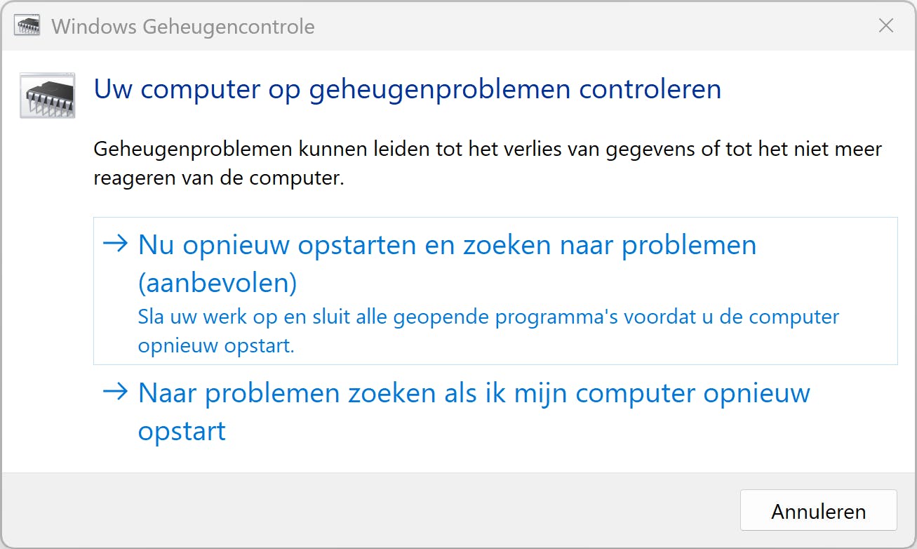 - RAM controleren met Geheugencontrole