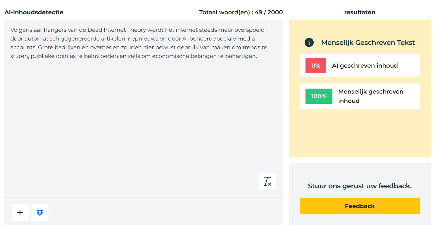 AI-detectiesoftware is nog verre van betrouwbaar. De tekst in deze afbeelding is volledig door AI geschreven, maar de software denkt daar anders over.