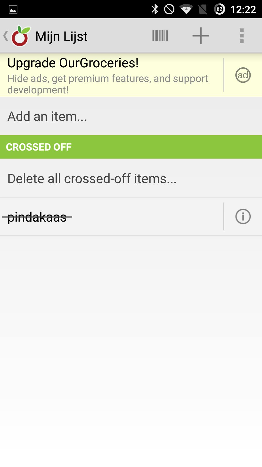 Als je op die lijst klikt, zie je 'Add an item' staan, waarmee je een artikel zoals pindakaas kan toevoegen. Klik je op dat item, dat komt het onderaan te staan met een streep erdoor.