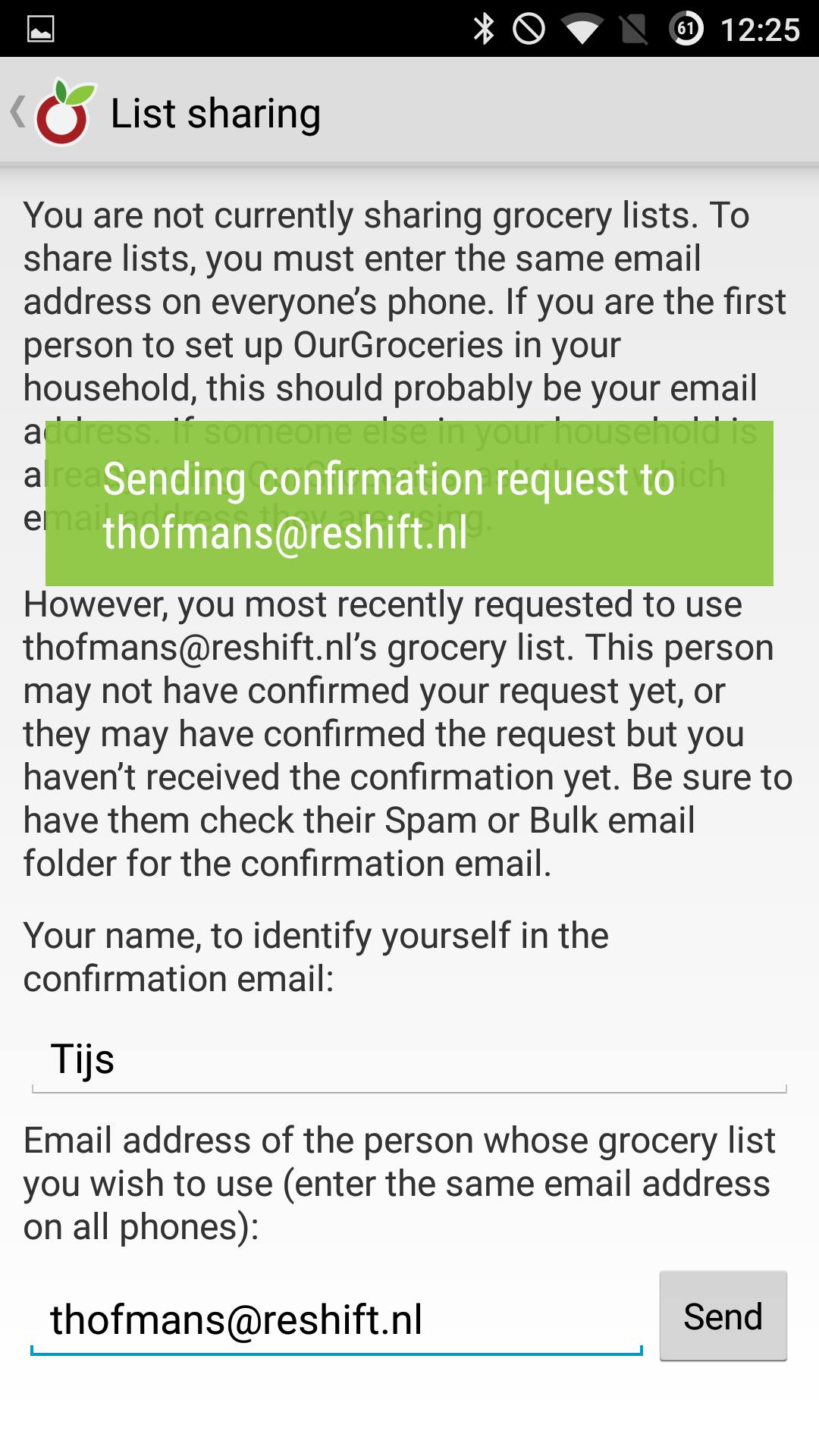 Je kunt hier je naam en je eigen emailadres invullen. Dat betekent dat je al je boodschappenlijst openbaar maakt. Andere gebruikers kunnen die alleen zien als jij er toegang toe geeft. Druk daarvoor op 'Send'.