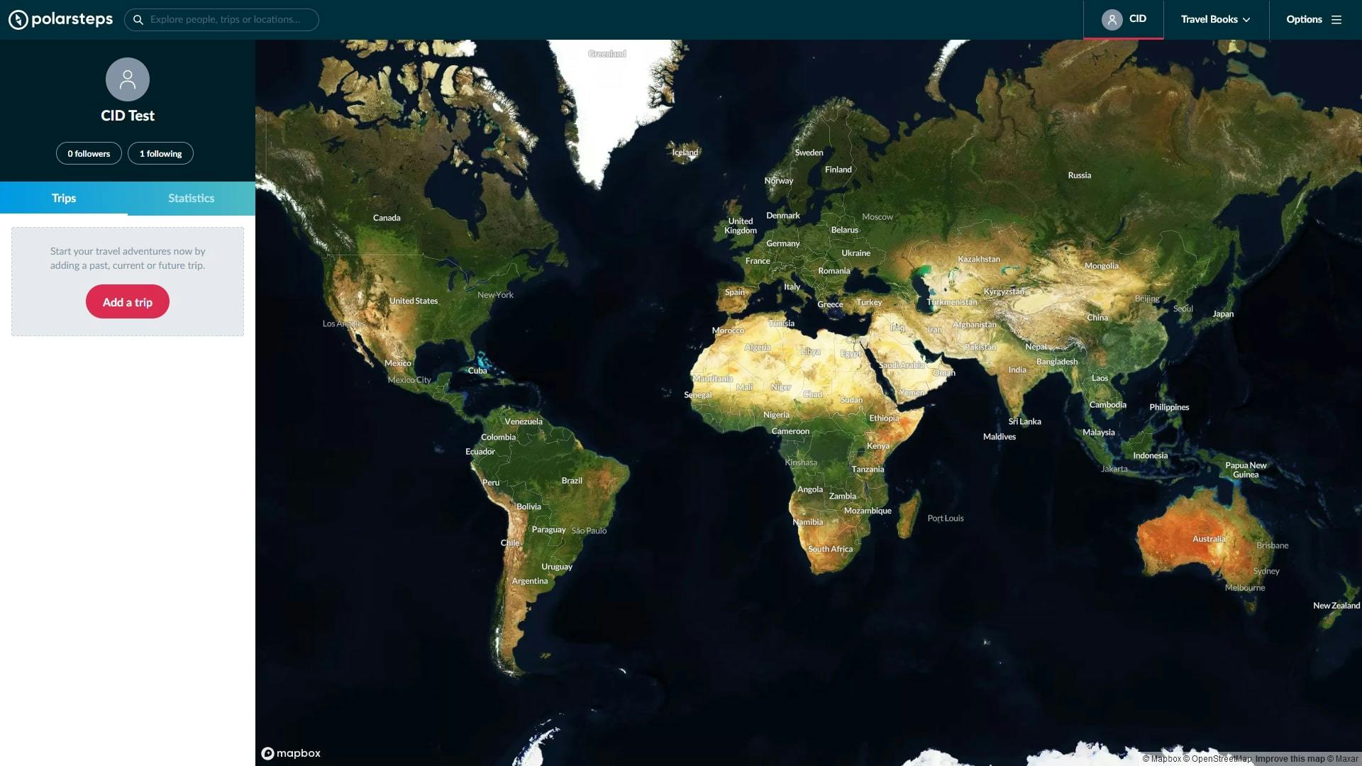 Wij gaan verder met de onlineversie; daar zien we een wereldkaart en links een paneel met onze gebruikersnaam, volgers en mensen die wij volgen, en een knop om een trip aan te maken.