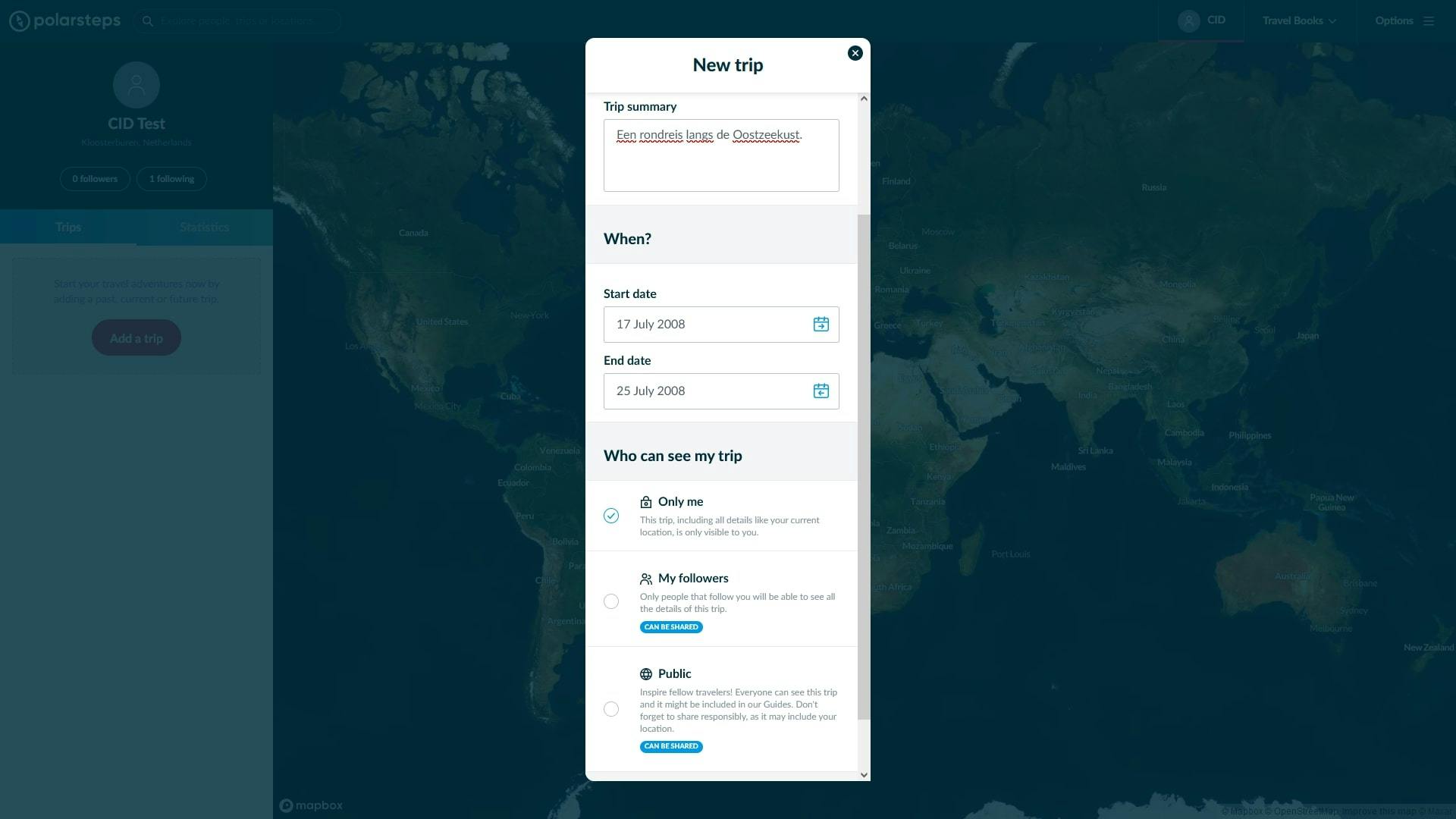 Tot slot moeten we kiezen met wie we de reis willen delen. In eerste instantie kiezen we ervoor om de reis voor onszelf te houden (Only me). Op de andere opties komen we nog terug. Tot slot klikken we op Add trip om deze reis aan te maken.