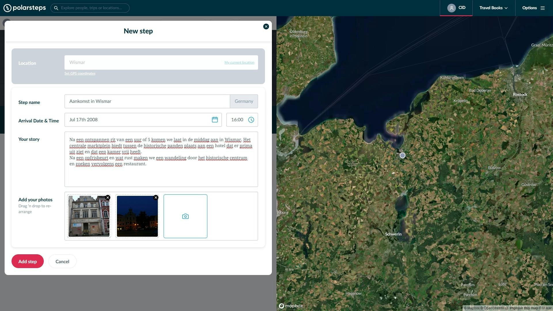 Polarsteps heeft nu een sjabloon gemaakt voor de reis op basis van de gegevens die we hebben opgegeven. In dit sjabloon kunnen we verschillende stappen van de reis invoeren met een klik op Add step.