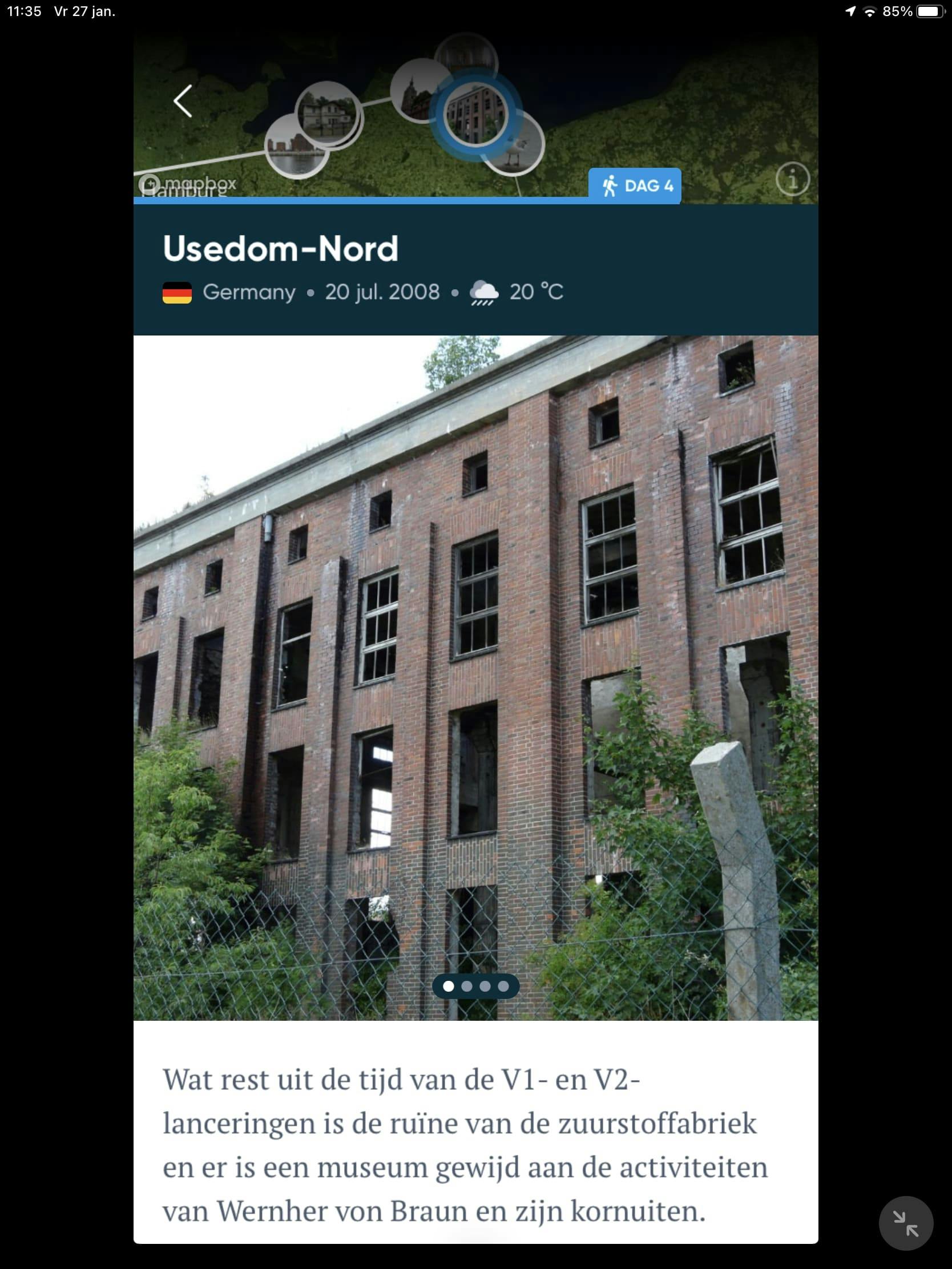 Zodra we in de app zijn ingelogd, zien we de reis waaraan we in de voorgaande stappen hebben gewerkt. Als je daar doorheen bladert, zie je iets dat je op de website niet zag: zoals het zonnetje dat je vroeger op een ansichtkaart tekende, toont Polarsteps voor elke dag weerdata van de locatie waar je die dag was. Dat geldt zelfs voor de reis uit een ver verleden die wij voor deze workshop invoerden. Een speurtocht door de archieven met historische weergegevens leert dat het nog aardig klopt ook!