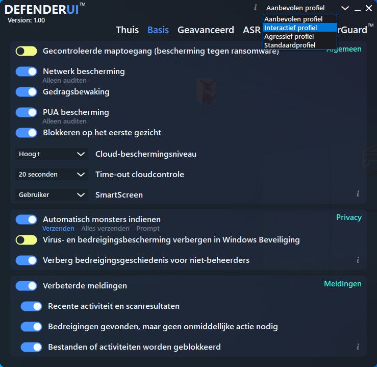 Je downloadt DefenderUI op www.defenderui.com (voor Windows 10 en Windows 11). Met enkele muisklikken installeer je de app. Bij de eerste opstart kun je Dutch instellen als interfacetaal en duid je een beveiligingsprofiel aan: Aanbevolen, Interactief, Agressief of Standaard.