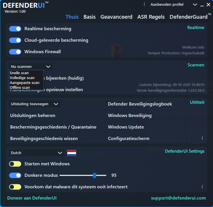 Het programma is ook bereikbaar vanuit een pictogram in het Windows-systeemvak. Rechtsklik hierop en kies DefenderUI tonen voor het programmavenster. Vanuit dit contextmenu kun je ook je pc op malware scannen, maar deze opties vind je eveneens terug op het tabblad Thuis (hier zijn zelfs meer scanopties beschikbaar: Snelle, Volledige, Offline of Aangepaste Scan) en je kunt hier ook de virushandtekeningen bijwerken.