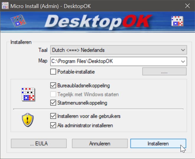 Ga naar de website www.softwareok.com en haal daar een installer van DesktopOK op in de 32bit- of 64bit-versie. Het zip-bestand kun je uitpakken, als Administrator voor Alle gebruikers installeren en meteen Nederlandstalig maken!