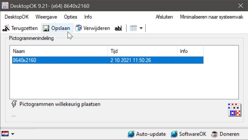 De truc van DesktopOK is ‘het kunnen stilzetten van de tijd’. Activeer DesktopOK en klik op de knop Opslaan. Daarmee maak je een bureaublad-opname van precies dít moment. Het moment wordt dus vastgelegd voor de huidige resolutie van het bureaublad, waarbij je die resolutie handig in de naam van het ‘snapshot’ ziet terugkomen. Let op: er wordt dus expliciet onderscheid gemaakt tussen verschillende resoluties. Dat is reuze handig voor alle laptopgebruikers die thuis of op de zaak aankoppelen op een groot beeldscherm. Dus: verschillende bureaublad-indelingen voor verschillende resoluties.