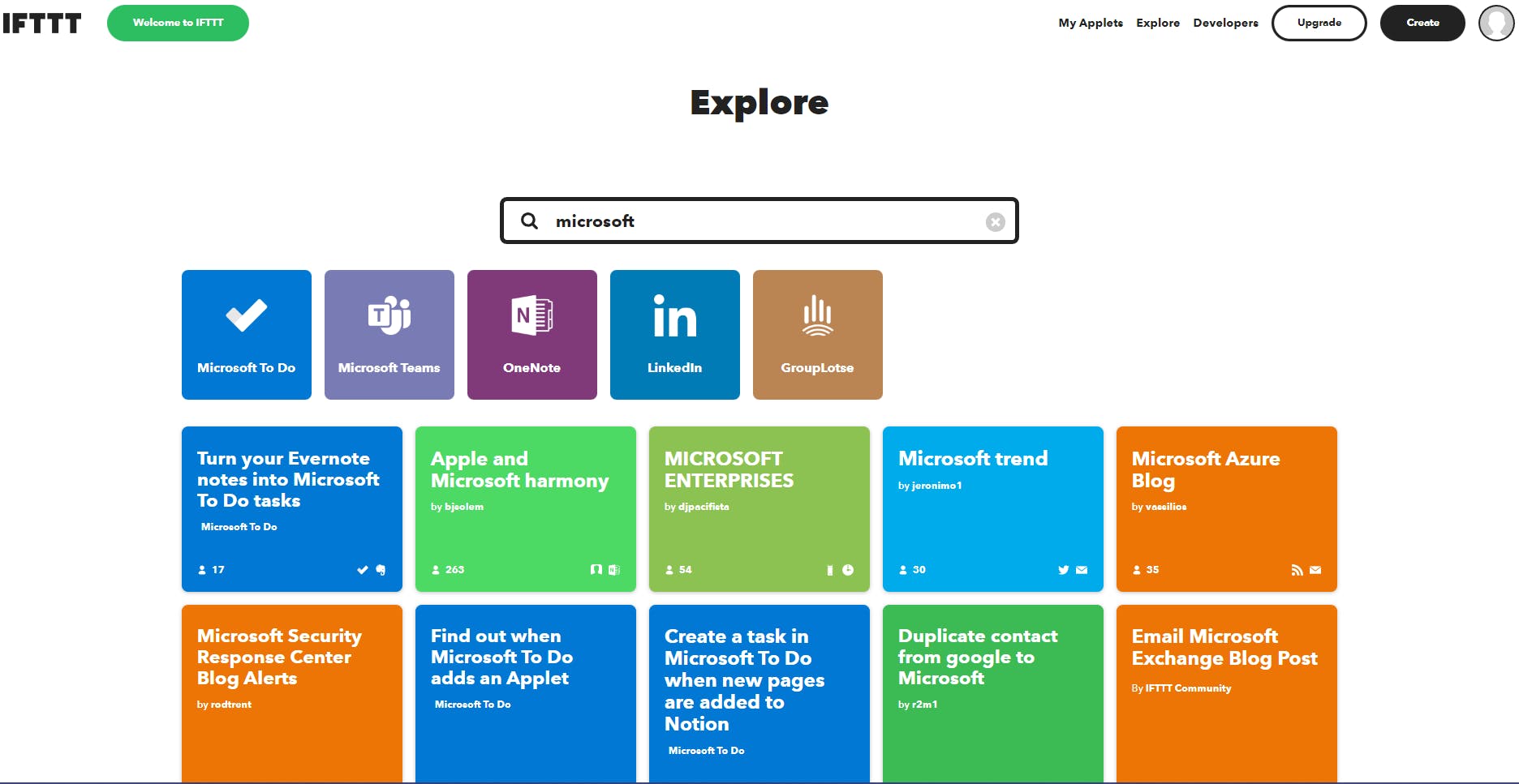 Er is tevens een zoekbalk om gerichter naar applets te speuren. Tik je bijvoorbeeld Microsoft in, dan verschijnen honderden applets, maar je kunt verder inzoomen door bijvoorbeeld op Microsoft Teams of LinkedIn te klikken. Vervolgens verschijnen allerlei diensten die je aan de reeds geselecteerde dienst kunt koppelen (in het geval van Microsoft Teams zijn dat bijvoorbeeld Twitter en Instagram).