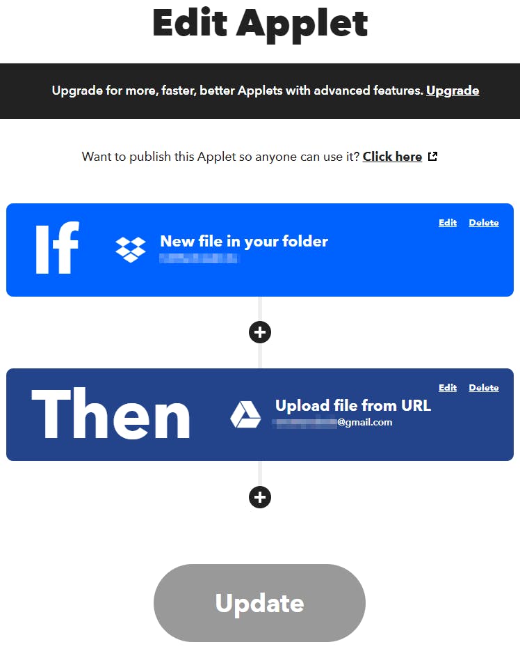 Voor je zelf aan de slag gaat om een eigen applet te bouwen, doe je er goed aan enkele gepubliceerde applets uit te proberen. We nemen eerst een eenvoudige applet als voorbeeld, die nauwelijks of geen configuratie vereist. Stel, je wilt alle bestanden die je naar Dropbox uploadt automatisch ook naar Google Drive kopiëren, een simpele synchronisatie-operatie dus (en tegelijk een mooie aanvulling op het artikel rond cloudbeheer, elders in dit nummer).